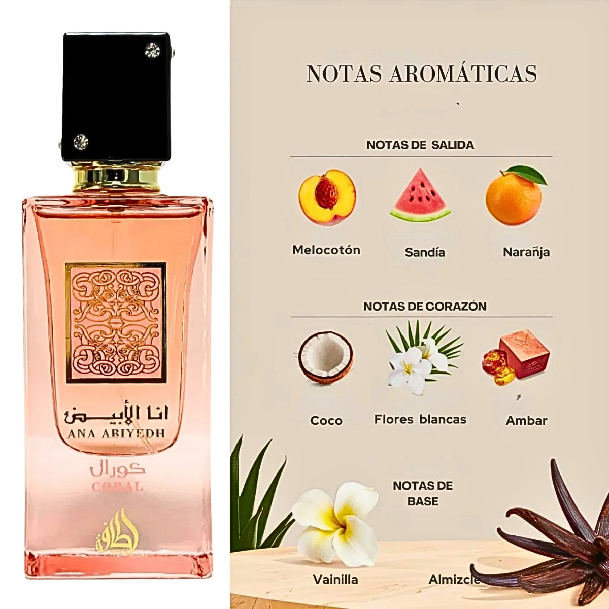 🌸 Ana Abiyedh Coral de Lattafa Perfumes (2025) es una fragancia femenina floral frutal llena de frescura y dulzura exótica, diseñada para mujeres que buscan un aroma alegre, moderno y con un toque elegante.